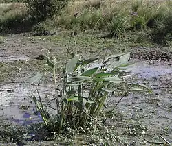 - Roślina wypuszcza od 2 do 6 liści odziomkowych oraz rzadko jeden lub dwa liście ogonkowe[7], wyrastające nad wydłużonym (0,7–2,5 m) międzywęźlem[6]. Pochwa liściowa nieuszkowata, gąbczasta, z wydatnymi przestrzeniami powietrznymi[6]. Ogonek liściowy do 2,5 cm długości, nagi[7]. Poduszeczka liściowa brązowawa, oliwkowa lub czerwonofioletowa[7]. Blaszka liściowa zielona, jajowata do eliptycznej, długości do 60 cm[7].
