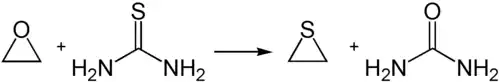 Tiiran otrzymuje się w reakcji tlenku etylenu z tiomocznikiem w środowisku wodnym. Produktami są tiiran i mocznik[5]: