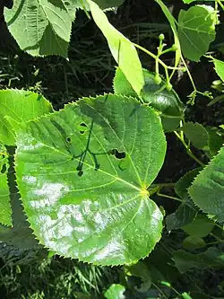 - Blaszka liściowa ma niemal okrągły kształt. Mierzy 7–9 cm długości oraz 5–7 cm szerokości, jest ząbkowana na brzegu, ma sercowatą nasadę i spiczasty wierzchołek. Ogonek liściowy jest nagi, o długości 20–30 mm[5].