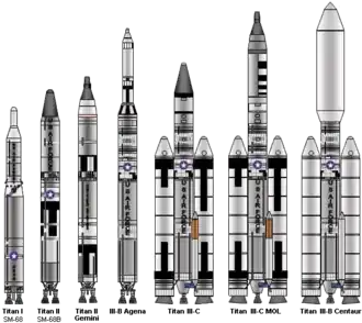 Większość rakiet Titan stanowi rozwinięcie pocisku balistycznego ICBM Titan II. Titan II był dwustopniowym pociskiem, wykorzystywanym przez USAF od połowy lat sześćdziesiątych do połowy lat osiemdziesiątych. W latach osiemdziesiątych część wycofywanych ze służby pocisków zmodyfikowano do roli rakiet nośnych. Ostatnia z tych zmodyfikowanych rakiet wyniosła z bazy sił powietrznych Vandenberg satelitę meteorologicznego w 2003 roku. Rakiety Titan II wykorzystywano także do wynoszenia amerykańskich załogowych pojazdów kosmicznych Gemini.