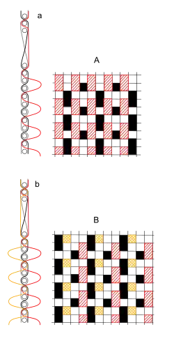 Przekroje obok rysunków splotu pokazują sposób tworzenia pętelki jednostronnej (a) i dwustronnej (b).