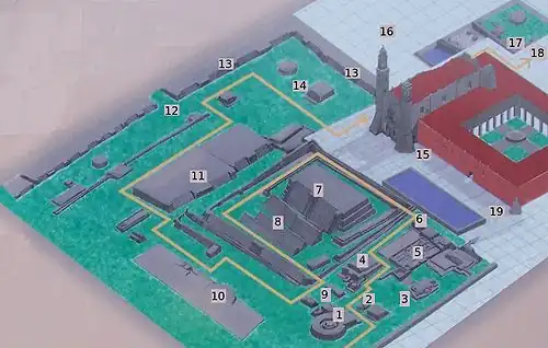 Stanowisko obejmuje pozostałości świątyń azteckich poświęconych Quetzalcoatlowi, Ehecatlowi i Huitzilopochtli. Na planie z lewej przedstawiono najważniejsze budowle.