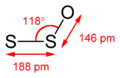 Cząsteczka ma strukturę kątową, kąt między wiązaniami wynosi 118°, długość wiązania siarka–siarka wynosi 188 pm, a wiązania tlen–siarka – 146 pm[5].
