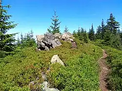 stromym podejściem odcinek o długości około 2,2 km, dochodząc do znajdującego się po prawej stronie szlaku skaliska szczytowego[6][12].