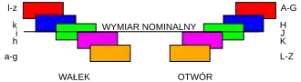 Drugim elementem określenia tolerancji jest łacińska litera, wielka w przypadku otworów i mała w przypadku wałków. Litera koduje położenie pola tolerancji w stosunku do wymiary nominalnego.