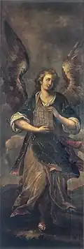 Dwaj pozostali aniołowie są malowani na znacznie węższych płótnach, sprawiając wrażenie obciętych i dostosowanych później do szerokości ścian. Obaj trzymają w rękach tuby oplecione gałązkami wawrzynu. Zespół anielski jest wyraźnym echem malarstwa weneckiego, co widać zarówno w ciepłej na ogół tonacji barwnej, jak i w ruchu postaci przypominających anioły ze „Zwiastowania” mistrza Paola.