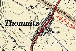 Nazwa wsi została utworzona od imienia Toma – Tomasz. Wieś po raz pierwszy wzmiankowana była pod nazwą Thomicz w XIII wieku[9]. Do 1936 używana była niemiecka nazwa Thomnitz. Ze względu na jej polskie pochodzenie, w 1936 w miejsce nazwy nazistowska administracja III Rzeszy wprowadziła nową, niemiecką – Thomas[10].