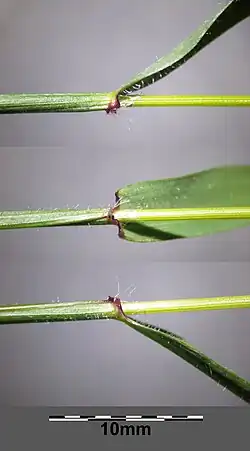 - Dolne liście o długich blaszkach, górne o krótkich. Wszystkie liście owłosione, języczek liściowy krótki (do 4 mm), owalny, poszarpany, porośnięty po bokach kępkami włosków.