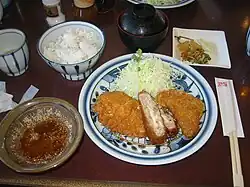 - główna część zestawu (teishoku) lunchowego; kotlet jest pokrojony na cząstki o wielkości jednego kęsa, dogodnego do ujęcia pałeczkami (hashi)[2]; w zestawie jest ryż, poszatkowana kapusta, sos w stylu Worcester oraz zupa miso[3];