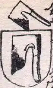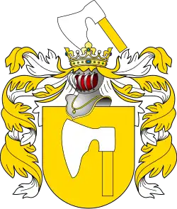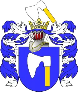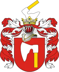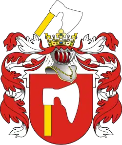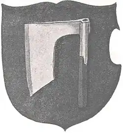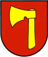 Na tarczy w polu czerwonym topór srebrny o toporzysku złotym.