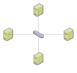 W najprostszej odmianie sieć o topologii gwiazdy zawiera przełącznik (ang. switch) lub koncentrator (ang. hub) łączący pozostałe elementy sieci. Zwykle większość zasobów w takiej sieci znajduje się na serwerze dedykowanym, którego zadaniem jest przetwarzanie danych i zarządzanie siecią. Pozostałe elementy tej sieci nazywa się terminalami – korzystają one z zasobów zgromadzonych na serwerze, a same zazwyczaj mają niewielką moc obliczeniową.