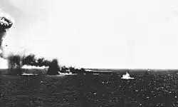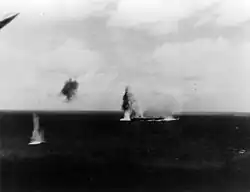 - ↑ Według niektórych źródeł, „Musashi” został trafiony 19 bombami przeciwpancernymi i 17 torpedami Mk 13[21].