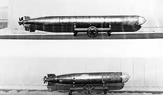 - ↑ Amerykańska nomenklatura nazewnicza torped zmieniała się parokrotnie. Pierwsze amerykańskie torpedy oznaczane były nazwą producenta, rozmiarami i numerem „Mark” (model), w skrócie: Mk. Dodatkowo używano również liter dla odróżnienia modeli i modyfikacji. W 1913 roku numer Mark stał się standardowym sposobem oznaczania amerykańskich torped, kiedy to torpedy zostały przekwalifikowane w ten sposób – z dodatkiem „Mod” na oznaczenie modyfikacji. Wszystkie torpedy oznaczane były od tego momentu numerem „Mark” zapisanym cyframi rzymskimi. Ta konwencja była używana do 1943 roku, kiedy to cyfry rzymskie zastąpiono cyframi arabskimi[4]. Celem ujednolicenia oraz uniknięcia nieporozumień, wzorem niektórych źródeł wszystkie oznaczenia torped w artykule podawane są w ostatniej z tych konwencji w postaci cyfr arabskich.