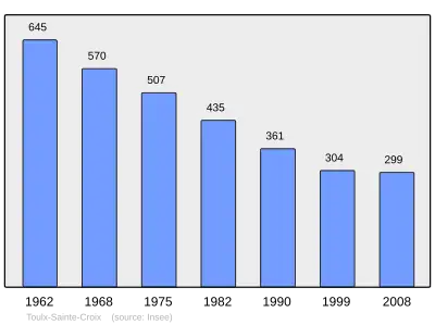 Według danych na rok 1990 gminę zamieszkiwało 361 osób, a gęstość zaludnienia wynosiła 10 osób/km² (wśród 747 gmin Limousin Toulx-Sainte-Croix plasuje się na 317. miejscu pod względem liczby ludności, natomiast pod względem powierzchni na miejscu 109.).