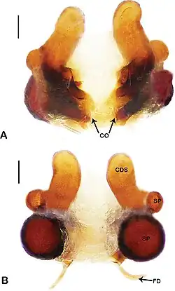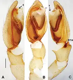 Nogogłaszczki samca cechują się wstęgowatą w widoku grzbietowym i tępoguzkowatą w widoku brzusznym apofizą retrolateralną, V-kształtnym w widoku brzusznym przewodem nasiennym, biorącym początek na godzinie dziewiątej dużym i zakrzywionym embolusem oraz w widoku tylno-bocznym częściowo przysłaniającą embolus, błoniastą u szczytu apofizą medialną. Samica ma ciemnorudobrązową, silnie zesklerotyzowaną płytkę płciową z małymi i dość blisko siebie umieszczonymi otworami kopulacyjnymi, szeroką bruzdą pośrokdową, dość długim cul de sacs oraz spermatekami tylnej pary trzykrotnie większymi niż drobne spermateki pary przedniej[1].