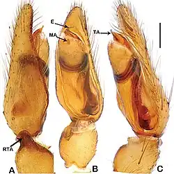 Nogogłaszczki samca cechują się nieco pochyloną, przysadzistą, przeciętnie długą, tępo zakończoną apofizą retrolateralną, niewielką apofizą medialną, U-kształtnym w widoku brzusznym przewodem nasiennym, błoniastą wierzchołkową częścią tegulum oraz pazurkopodobnym embolusem. Samica ma żółtawobrązową, zesklerotyzowaną płytkę płciową z wpukloną pośrodku krawędzią przednią i szeroką bruzdą pośrodkową rozdzielającą dwie prześwitujące przez płytkę spermateki o kulistym zarysie oraz krótkie cul de sacs[1].