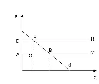Stratę spowodowaną przez wprowadzenie podatku od towarów można wyrazić w kategoriach zmniejszenia nadwyżki konsumenta. Na zamieszczonym rysunku jest przedstawiona nadwyżka konsumenta przed i po wprowadzeniu podatku na rynku doskonale konkurencyjnym w wysokości AD, który w całości jest przerzucany na cenę finalną danego dobra. Prosta d jest skompensowaną krzywą popytu na dane dobro. Przed wprowadzeniem podatku punktem równowagi był punkt B. Jego wprowadzenie w wysokości AD przesuwa krzywą podaży w górę o wartość równą wielkości podatku, zaś nowym punktem równowagi staje się E. Nadwyżka konsumenta zmniejsza się zatem o ABED. Część owej straty (AGED) może się stać źródłem wzrostu użyteczności w wyniku przeznaczenia tych środków na finansowanie wydatków państwa. Pozostała część (EGB) zwana trójkątem Harbergera to nieodwracalna strata społeczna.