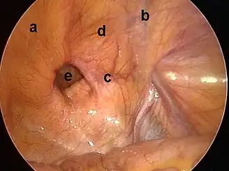 a. mięsień prosty brzucha; b. naczynia nabrzuszne dolne; c. więzadło pachwinowe; d. trójkąt Hesselbacha; e. przepuklina pachwinowa prosta