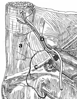 a. mięsień prosty brzucha; b. naczynia nabrzuszne dolne; c. więzadło pachwinowe