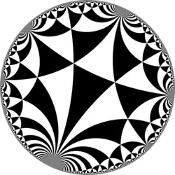 W tak zwanym modelu konforemnym geometrii hiperbolicznej punktami są punkty wnętrza koła, a proste są łukami okręgów prostopadłych do brzegu tego koła. Punkty brzegu koła są punktami w nieskończoności geometrii hiperbolicznej. Na ilustracji wszystkie elementy parkietażu koła są trójkątami asymptotycznymi, bo jeden z ich wierzchołków leży na okręgu ograniczającym koło. Na rysunku widać, dlaczego kąt przy wierzchołku w nieskończoności trójkąta asymptotycznego jest kątem zerowym. Oba łuki są prostopadłe do brzegu koła w tym samym punkcie, czyli są styczne do siebie. Podobne parkietaże były motywami grafik Mauritsa Eschera[5]. Grafiki oparte na motywach geometrii hiperbolicznej rozpoznać można po tym, że elementy maleją wraz ze zbliżaniem się do brzegu koła.