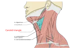 Na obszarze tego trójkąta tętnica szyjna wspólna dzieli się na wewnętrzną i zewnętrzną.