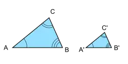 - Cecha kkk (kąt-kąt-kąt) – zachowane są miary odpowiednich kątów (tu wystarczy równość dwóch par kątów, czyli cecha kk, bo miary kątów trzeciej pary muszą być równe, gdyż suma miar kątów trójkąta jest równa 180°).