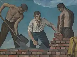- Także w 1950 roku, na I Ogólnopolskiej Wystawie Plastyki Wojciech Fangor zaprezentował obraz olejny Murarze, przedstawiający trójkę murarską podczas pracy. Jeden mężczyzna wylewał zaprawę, usytuowany w centrum kompozycji układał cegły, a stojący po prawej stronie obrazu je przynosił[11].