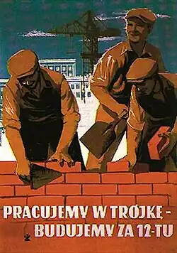 - Losy przodowników pracy w kontekście niesprawiedliwości społecznej porusza film Człowiek z marmuru[1], a akcja oparta jest na incydencie podczas pracy trójki murarskiej[13].