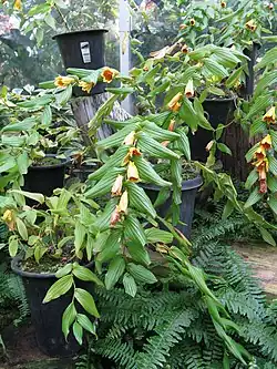 - Kwiaty zebrane w kłos złożony, rzadziej w grono, wzniesione lub rzadziej zwisłe[8]. Okwiat pojedynczy, dzwonkowaty lub trąbkowaty, sześciolistkowy. Listki okwiatu wolne, białe lub żółte z purpurowymi kropkami, zwykle dystalnie odgięte; zewnętrzne woreczkowate lub ostrogowate[7]. U nasady trzech zewnętrznych listków okwiatu obecne są miodniki, tworzące kuleczkowate woreczki lub krótkie ostrogi[8]. Pręciki osadzone u nasady listków okwiatu. Nitki pręcików lekko spłaszczone, proksymalnie nachylone ku sobie i tworzące krótką rurkę[7]. Główki pręcików elipsoidalne[8]. Zalążnia wąsko elipsoidalna, trzykomorowa[8]. Szyjka słupka kolumnowata, zakończona wyraźnie trójklapowym, rozwartym znamieniem, niekiedy o rozszczepionych klapach[7].
