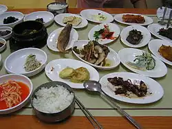 Podstawową potrawą w Korei jest ryż. równie popularna jest także fasola. Ze względu na to, że kraj z trzech stron otaczają morza, popularne są także ryby i owoce morza. Od dawnych czasów znane są metody fermentowania jedzenia, otrzymuje się w ten sposób piklowane ryby i warzywa, co zapewnia odpowiednią ilość witamin podczas zimy.