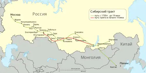 Początkowo trakt przebiegał z Moskwy przez Murom, Koźmodiemiansk, Kazań, Osę, Perm, Kungur, Jekaterynburg, Tiumeń, Tobolsk, Tarę, Kaińsk, Koływań, Tomsk, Jenisejsk, Irkuck, Werchnioudińsk, Nerczyńsk do Kiachty na granicy z Chinami, gdzie trakt się kończył. Dalej droga wiodła przez Mongolię Wewnętrzną do Kałganu - twierdzy przy Wielkim Murze Chińskim.