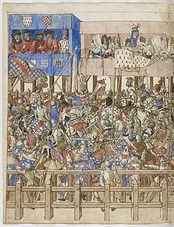Całostronicowa miniatura przedstawia jeden z ważniejszych momentów podczas turnieju rycerskiego – składanie przyrzeczenia przez rycerstwo. Przy szrankach umieszczone zostały loże dla wysoko urodzonych. Z lewej strony znajduje się loża obita niebieskim suknem i ozdobiona herbami, w której zasiadają sędziowie jednakowo odziani w malinoworóżowe houppelande i kapelusze typu chaperon. Wśród nich znajduje się również herold organizatora turnieju. W sąsiedniej, jasnoróżowej loży artysta przedstawił modnie ubrane damy w wysokich czepcach, z biżuterią ozdabiającą dekolty. U spodu lóż, w szrankach widoczny jest orszak rycerzy bretońskich, którzy złożywszy przyrzeczenie gotują się do opuszczenia placu. Z prawej strony nadjeżdża kawalkada rycerzy księcia de Burbon, o czym świadczy proporzec z liliami heraldycznymi w kratownicy przepasany czerwonym skosem[1]. Po złożeniu przyrzeczenia przez drugi orszak dojdzie do pojedynku, co ukazane zostało na kolejnej miniaturze[1].