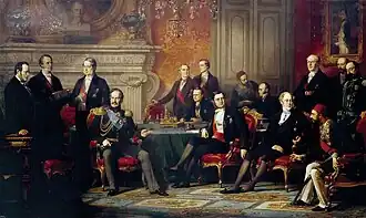 - ↑ Obrady toczyły się pod przewodnictwem francuskiego ministra spraw zagranicznych hrabiego Aleksandra Walewskiego.