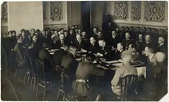 Traktat ryski (lub inaczej pokój ryski), Traktat pokoju między Polską a Rosją i Ukrainą, podpisany w Rydze dnia 18 marca 1921 r.[1] – traktat pokojowy zawarty między Rzecząpospolitą Polską a RFSRR i USRR, ratyfikowany[2] przez Naczelnika Państwa marszałka Józefa Piłsudskiego 16 kwietnia 1921; obowiązywał od 30 kwietnia 1921, tj. wymiany dokumentów ratyfikacyjnych przez strony, co nastąpiło w Mińsku[3]. Podpisanie traktatu miało miejsce 18 marca 1921 o godz. 20:30 w Domu Bractwa Czarnogłowych w Rydze[4]. Traktat składał się z 26 artykułów. Obydwie strony zobowiązały się w nim do nieingerowania w sprawy wewnętrzne drugiego państwa.