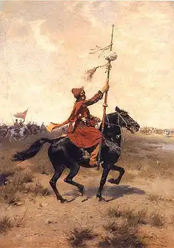 - ↑ Określani byli jako „kozacy”; tam też zyskali złą sławę jako wojsko niezdyscyplinowane oraz sprawcy licznych grabieży i okrucieństw; spalili m.in. 63 wsie, biorąc w niewolę – niezgodnie z ówczesną normą – również starców, dzieci i kobiety, Szadkowski 2020, s. 66–67.