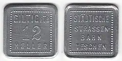 - 1 2 16 halerzy - Tramwaje w Cieszynie (mosiądz) - Żetony lokalne - pozostali producenci - III RP - Żetony - Pieniądz zastępczy - Internetowy Katalog Monet [online], www.katalogmonet.pl [dostęp 2025-01-20].