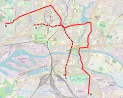 | 5 | Ulica Bassiejnaja – Festiwalnaja alleja – prospekt Sowiecki – pl. Pobiedy – prospekt Lenina – ul. Szewczenki – Dom Byta – prospekt Moskiewski – ul. Październikowa – ul. Dzierżyńskiego – al. Śmiałych – ul. Diunnaja |