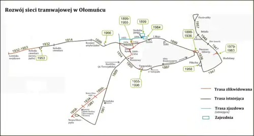 - ↑ olomouckamhd.ic.cz: Budoucnost tramvajové dopravy v Olomouci. [dostęp 2008-12-04]. [zarchiwizowane z tego adresu (6 grudnia 2008)]. (cz.).