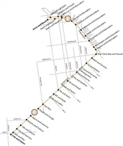 - linia California Street ciągnie się wzdłuż ulicy California Street, od dzielnicy finansowej przez Chinatown i Nob Hill do stacji na ulicy Van Ness Avenue.