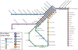 - system tramwajowy, złożony jest z jednej tradycyjnej linii – F Market & Wharves i siedmiu linii tramwajowych, które łączą w sobie cechy zarówno linii lekkiej kolei miejskiej jak i także tradycyjnego tramwaju – J Church, K Ingleside, L Taraval, M Ocean View, N Judah, S Castro Shuttle, T Third Street.