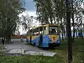 ![]() Tramwaj KTM-9KT z odbierakiem lirowym wyjeżdża z zajezdni | |