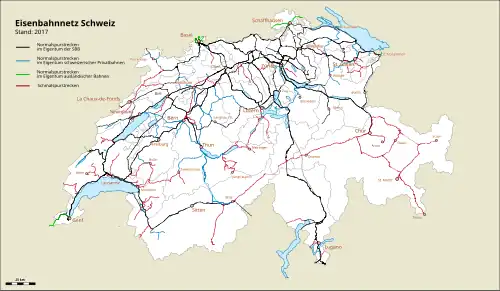 W 2015 roku długość całkowitej sieci kolejowej w Szwajcarii wynosiła 5323 km i liczyła 1838 stacji oraz przystanków kolejowych[7]. Największymi zarządcami infrastruktury byli: