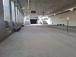 Przystanek "Sanktuarium Bożego Miłosierdzia" w tunelu tramwajowym, widok w kierunku Kurdwanowa.budowa ok. 0,7 km tunelu drogowego i równolegle tunelu tramwajowego od linii kolejowej Kraków Płaszów – Oświęcim do mostu na rzece Wildze, pod terenem Sanktuarium Bożego Miłosierdzia oraz Centrum Jana Pawła II[6],