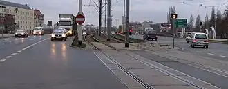 Na północno-zachodnim odcinku Trasy Mieszczańskiej (na ulicy Długiej) ruch ciężarowy jest w znacznym stopniu ograniczony przez przecinający tę ulicę stosunkowo wąski i niski wiadukt kolejowy (max. wysokość przejeżdżających pod nim pojazdów nie może przekraczać 3,3 m), widoczny na dolnej fotografii obok.