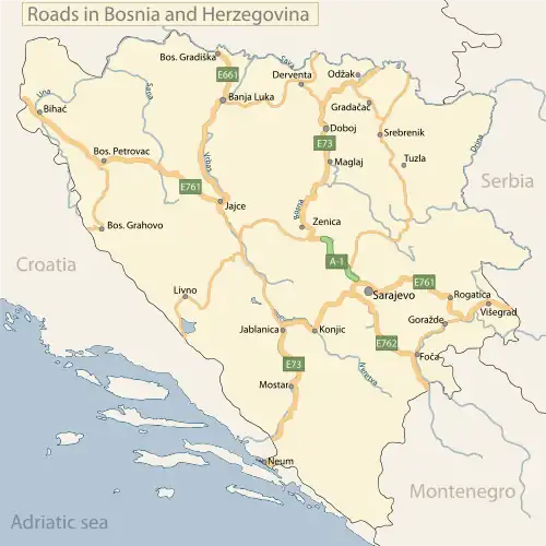 - trasa E 761 – Bihać – Jajce – Donji Vakuf – Zenica – Sarajewo – Užice – Čačak – Kraljevo – Kruševac – Pojate – Paraćin – Zaječar