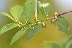 - Drobne, krótkoszypułkowe[6], skupione po 12–20 w gęste lub luźne kwiatostany wierzchotkowe[8]. Kwiaty zwykle są jednopłciowe i na jednej roślinie zwykle dominują albo kwiaty męskie, albo żeńskie[8]. Kwiaty rozwijają się po rozwinięciu liści[8]. Okwiat w kwiatach męskich, żeńskich i obupłciowych składa się zwykle z 5, rzadziej 4 listków. Pręciki (brak ich w kwiatach żeńskich) w tej samej liczbie co listki okwiatu. Zalążnia (w kwiatach męskich szczątkowa) kulista, omszona, z dwoma trwałymi i nagimi szyjkami słupka zakończonymi nierozgałęzionymi znamionami[6][8].