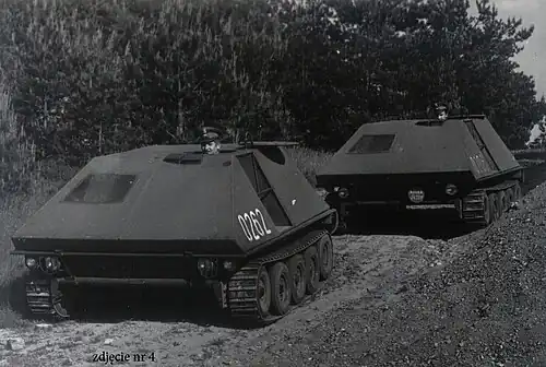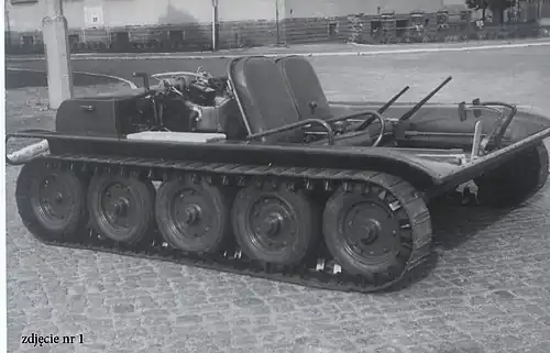 Pierwsza wersja to mały pojazd gąsienicowy (MPG) przeznaczony do nauki jazdy ciągnikami gąsienicowymi, napędzany dwucylindrowym, czterosuwowym silnikiem motocyklowym M-72 o mocy 22 KM. W silniku tym zastosowano przymusowe chłodzenie przy pomocy dmuchawy połączonej z wałem korbowym silnika. Pojazd o masie 700 kg osiągał prędkość 50 km/h.
