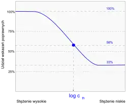 Przyjmując, w oparciu o prawo Webera–Fechnera, że udział poprawnych wskazań jest liniową funkcją logarytmu ze stopnia rozcieńczenia, dokonuje się interpolacji, obliczając jaka wartość logarytmu rozcieńczenia odpowiada udziałowi równemu 0,58. Jest on wyższy od wynikającego z definicji progu wyczuwalności (0,50), ponieważ uwzględniono prawdopodobieństwo losowych wskazań poprawnych (gdy próbka nie jest odróżnialna od powietrza, udział odpowiedzi poprawnych jest równy około 33%).
