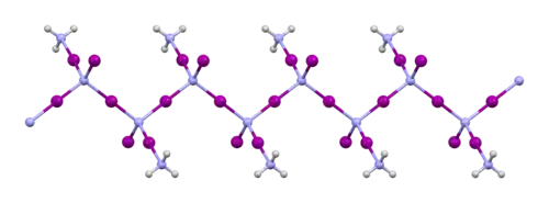 3. Nie da się z niego usunąć cząsteczek amoniaku i uzyskać wolnego jodku[1]. W takiej formie został otrzymany w roku 1813 przez odkrywcę jodu, Bernarda Courtois[2]. Jego budowa została potwierdzona w roku 1905[3]. Struktura krystaliczna amoniakatu składa się z zygzakowatych łańcuchów złożonych ze współwierzchołkowych tetraedrów NI