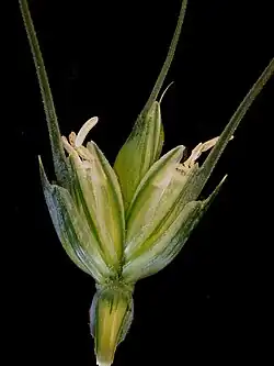 - Zebrane w czworoboczny kłos składający się z kilku nie rozpadających się po dojrzeniu kłosków. Kłoski są zazwyczaj 4-kwiatowe, o mniej więcej takiej samej długości i szerokości. Dolna plewka, w zależności od odmiany, jest oścista, bezostna lub zaostrzona i ma taką samą długość, jak plewka górna[5]. Kwiaty są klejstogamiczne[6].